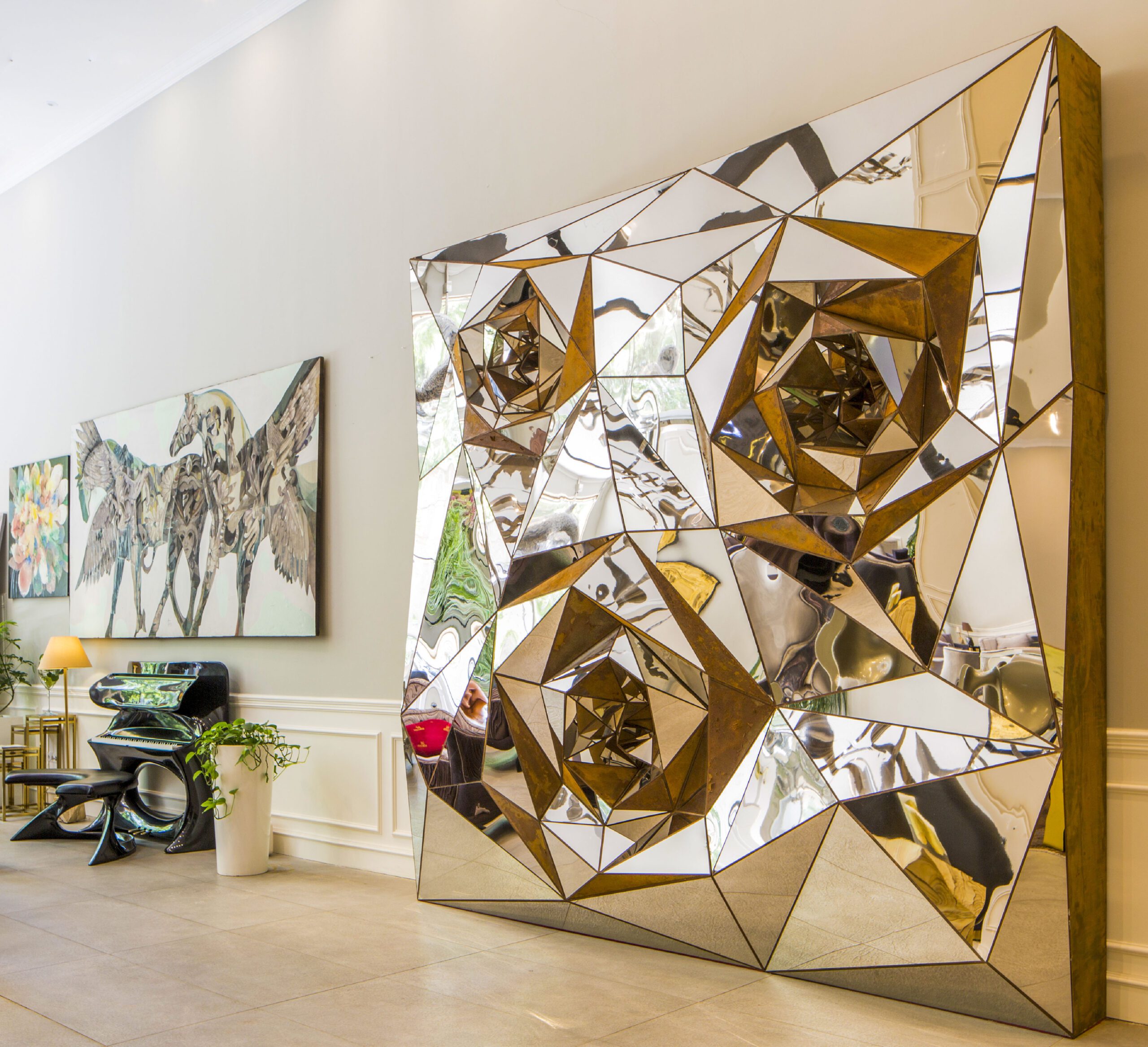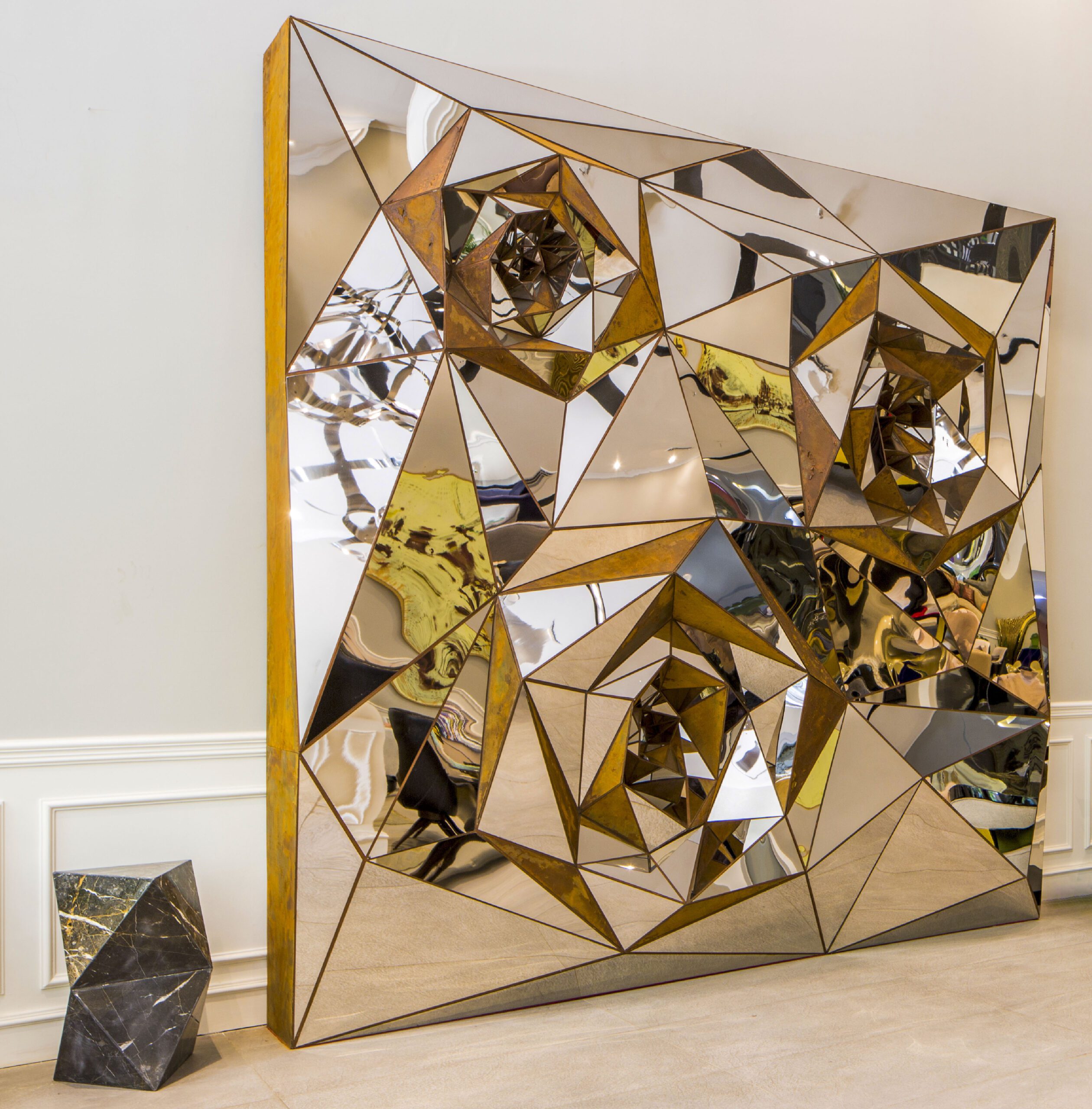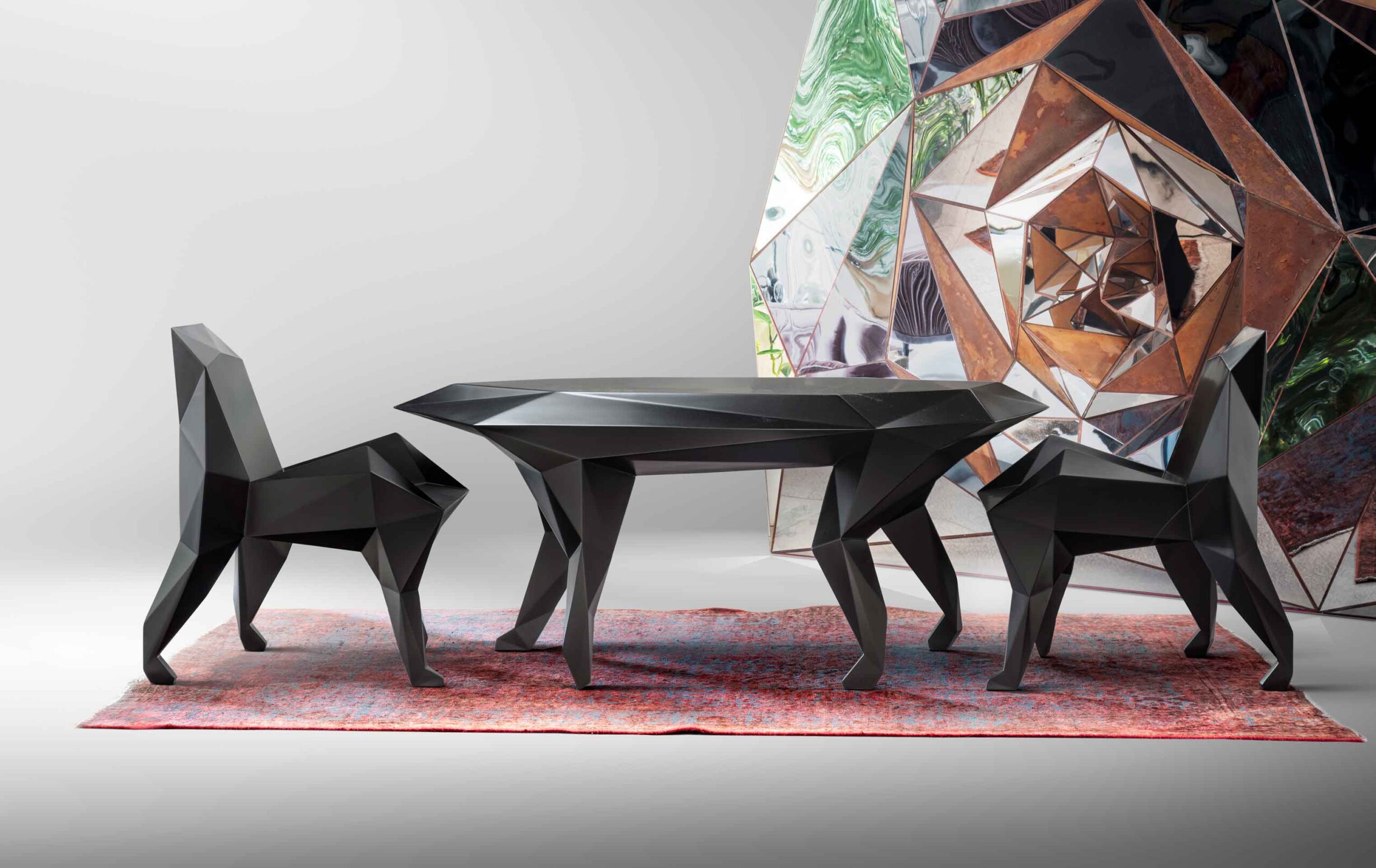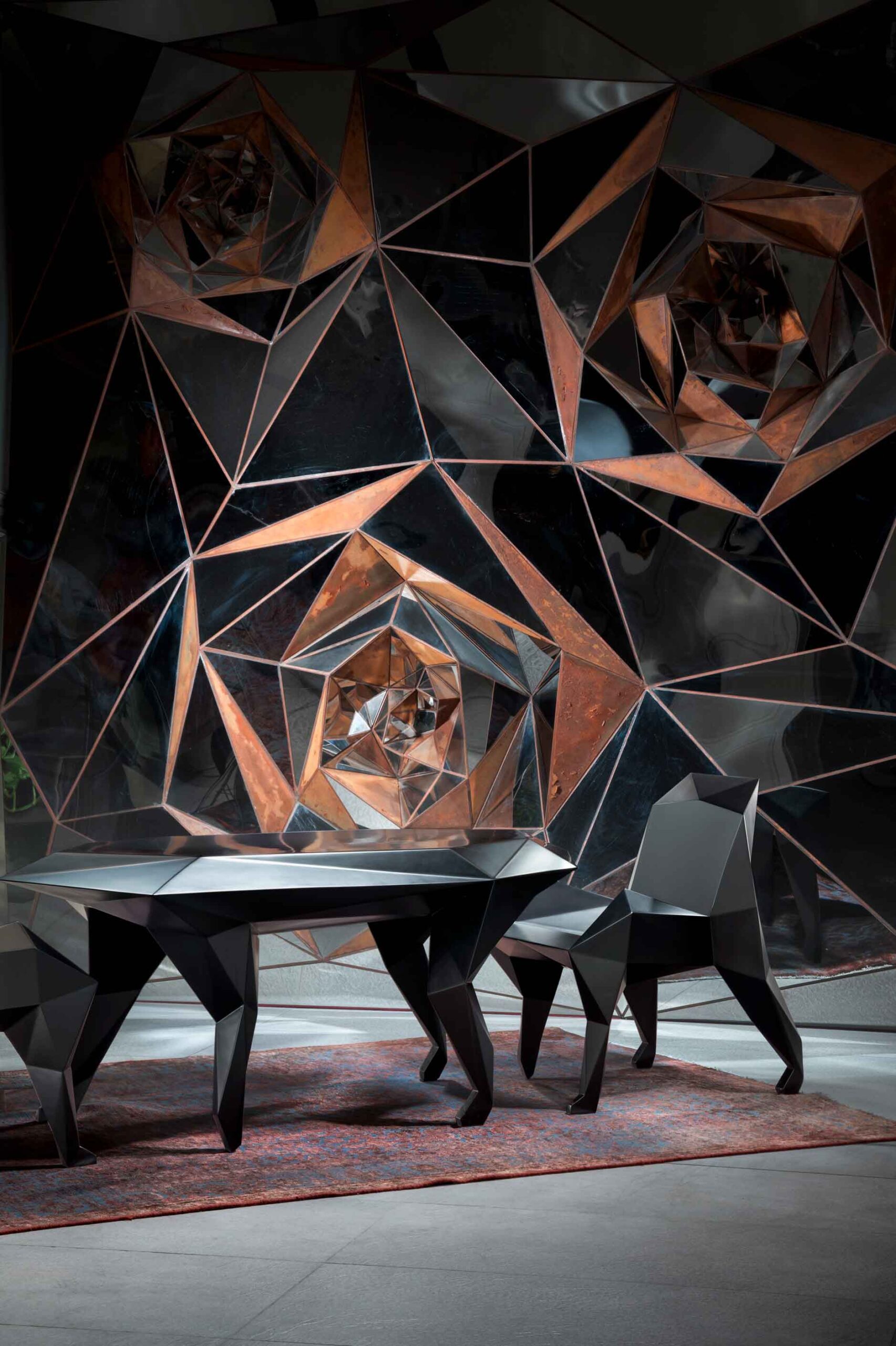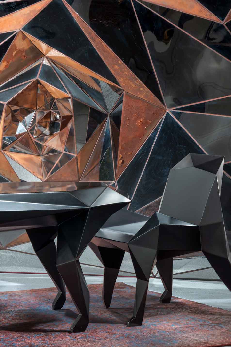 Kamran Afshar Naderi, is an architect, artist, architecture critic and co-founder of the Memar Magazine. During the past 5 years, he has been focusing on the creation of large-scale artworks on-demand. In his sculptural artwork, he uses different materials and ad-hoc techniques. Tree of Life, a 3 dimensional panel (H=9:50, W= 3.50 m), at IFCM institute in Lyon, Rose Garden 1 sculpture (H= 3.50, W = 3.50 m) at Villasufia Gallery in Tehran, Rose Garden 2 (H=6.00, W= 3.00 m) installed in a penthouse in northern Tehran, Tree of life 2 (H = 9.00, W = 3.00 m ) in the lobby of a large residential tower in northern Tehran, are among his most well-known works. Besides his artistic and architectural activities, he has designed several pieces of furniture for himself and for his projects. Patternitecture exhibition became an occasion for creating a new line of limited-edition furniture, inspired by ancient myths and iconography.